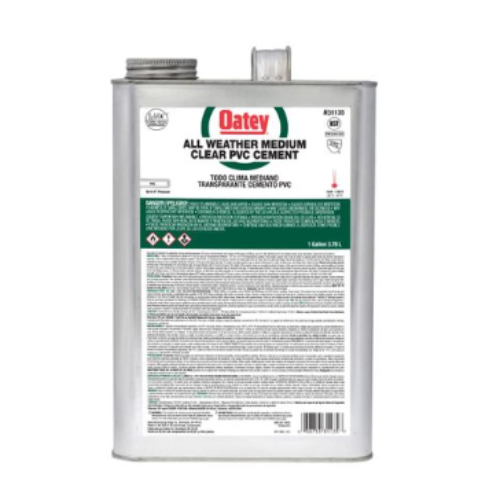Oatey® PVC All Weather Medium Bodied Fast Set Clear Cement is recommended for potable water, drain, waste and vent applications. It is formulated to perform in all weather conditions from -15°F to 110°F and applies easily. This clear, medium bodied, fast set cement can be used to solvent weld all schedules and classes of PVC pipe and fittings up to 6 in. diameter with interference fit. Oatey products have earned the trust of plumbing professionals for over 100 years.