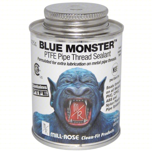 Blue Monster® Pipe Thread Sealant, Heavy Duty Industrial Grade, Can Container, 0.5 pt Container, PTFE Base, Composition: Ethylene Glycol Butyl Ether Synonym: 2-Butoxyethanol, Isopropyl Alcohol Synonym: 2-Propanol, White, Mild Odor/Scent, -50 to 400 deg F, 1.41 Specific Gravity, >200 deg F Flash Point, 310 g/L VOC, Bonds To: Metal, PVC, CPVC, ABS and Nylon Plastic Pipe Systems