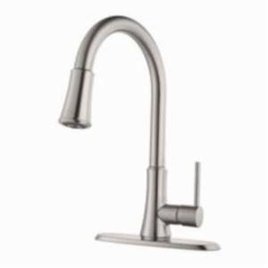 Pfister® Kitchen Faucet, Professional Grade Pull-Down, Pfirst Series™, 1.8 gpm, 8 in Center Distance, High-Arc Spout, 9-1/16 in Spout Reach, Lever, 1 Handle, 1/3 Faucet Holes, 1-1/4 in Faucet Hole, 1/2-14, NPSM, Function: Traditional, 3 Spray Functions, 2-1/4 in Maximum Deck Thickness, Deck Mount, Ceramic Disc Valve/Cartridge, 16-1/8 in H, Metal, Stainless Steel