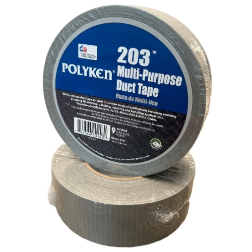 Polyken® 1092385 Duct Tape, Multi-Purpose, Series: 203, 55 m Length, 48 mm Width, 9 mil Thickness, Silver, Rubber Adhesive, Polyethylene Coated Cloth Backing, 85 in-oz Adhesion Strength, 27 in-lb Tensile Strength, 40 to 200 deg F Maximum Operating