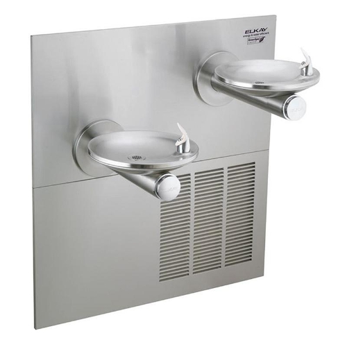 Provide your guests, customers, and staff with an easy and accessible way to quench their thirst with this Elkay ERPBGRNM28RAK SwirlFlo stainless steel 7.5 GPH reverse bi-level wall mount chilled non-filtered GreenSpec drinking fountain with splash-resistant oval basin and frame. With a stainless steel construction, this drinking fountain is sleek and durable and provides customers with easy access to fill their water bottles
