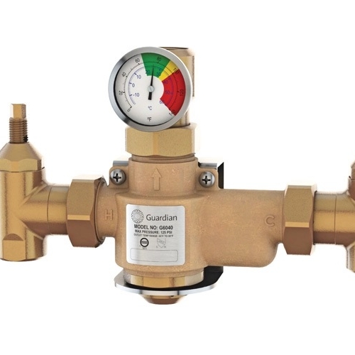 Thermostatic mixing valve to blend hot and cold water to deliver tepid water. Valve has flow capacity of 50 gallons (189 liters) per minute at 30 PSI (2.1 bar) pressure drop. Valve can be used to supply emergency shower or combination safety station. Depending on water supply size and pressure, valve can supply multiple units.